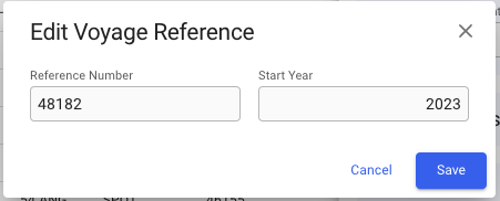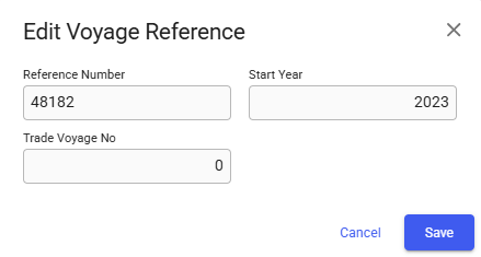 Clicking *Edit Voyage Reference...* or *Edit Voyage Number...* in the options meny opens a dialog box where the current values can be modified. In addition, the dialog box contains a field for changing the Voyage Start Year.