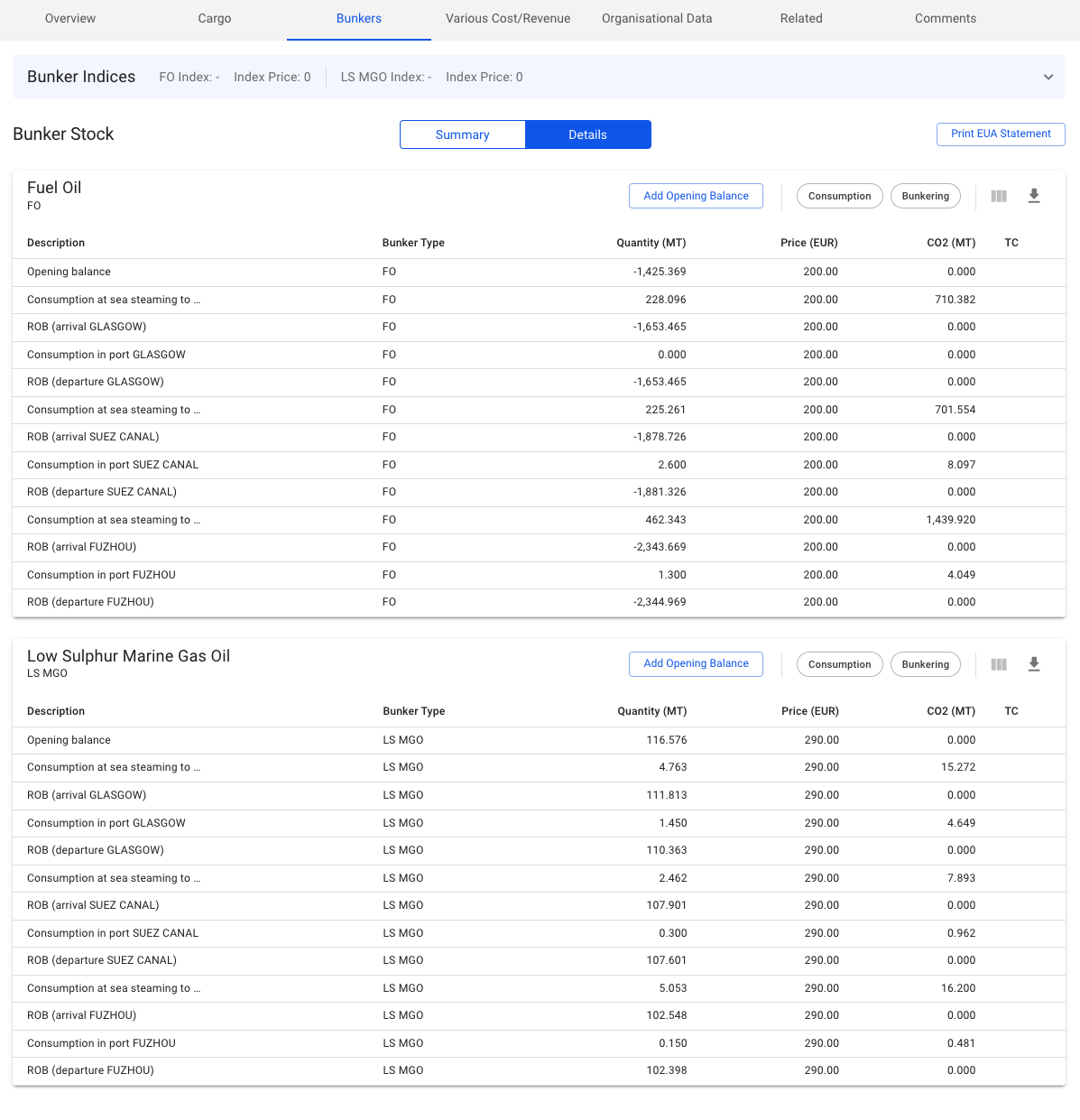 1. Bunker Indices: this section helps to have a better overview of bunker indices even when the fuel types FO and LS MGO are not consumed by a vessel. By default, the section is collapsed, providing information regarding the bunker indices. Once expanded, the indices can be altered. Refer to Figure 1 for example: