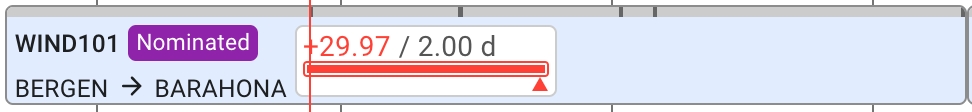 Scheduler bars can be found in the Schedule section and contain information about either allocated or nominated voyages, containing Reference No, Voyage Status, first Load Port and last discharge port. If the Laycan dates have been set, a Laycan indicator can also be viewed on a schedule bar. A timeline of the ballast and port calls can be viewed on top of each bar.