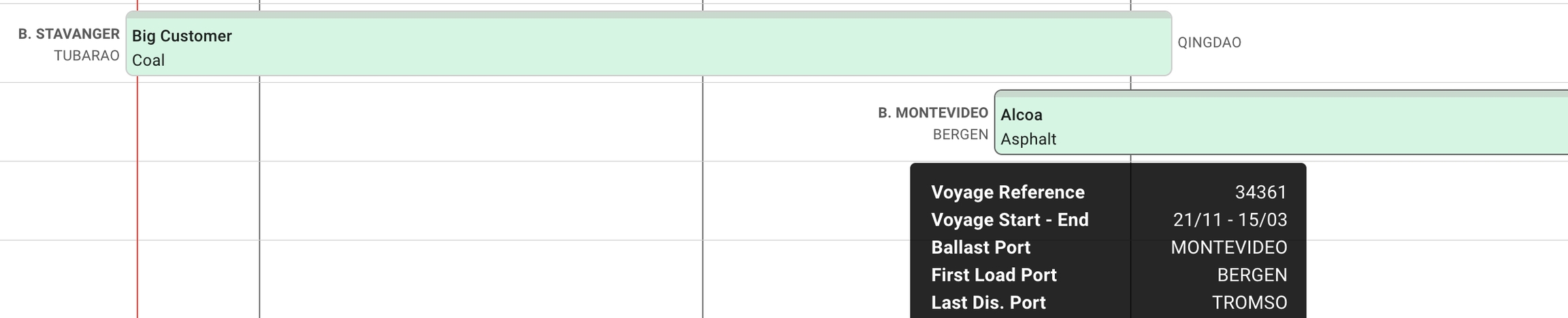 When hovering over a commitment bar, a tooltip will pop up with additional information about the voyage: