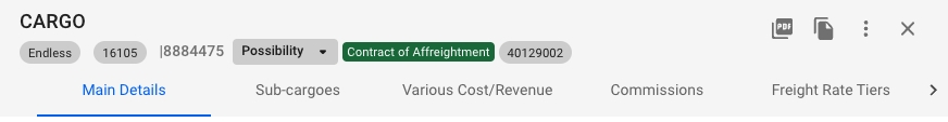 When you have connected the cargo to a CoA Line, you will see a chip at the top of the Cargo Drawer that says Contract of Affreightment as well as which CoA Line you've connected it to (40129002 in this example).