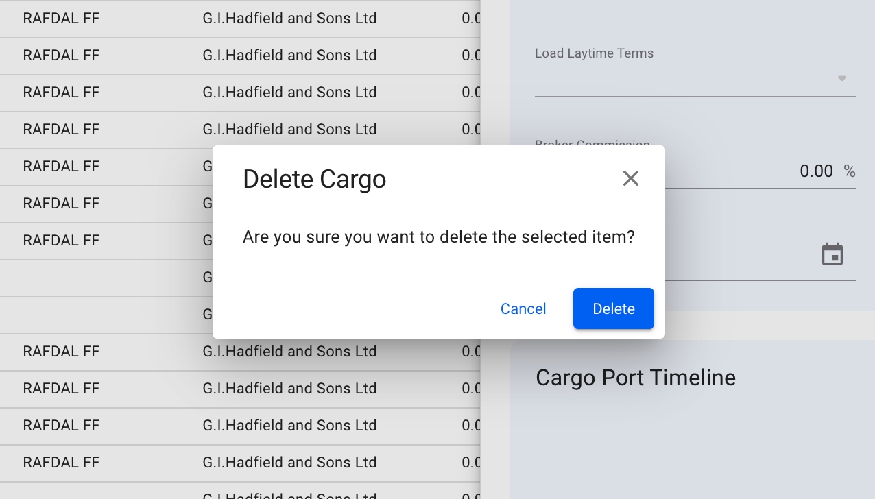 1️⃣ When deleting a cargo which has cargo ports linked to a port calls which are linked to some other cargos cargo ports you will get a simple confirmation message before cargo is deleted as per below