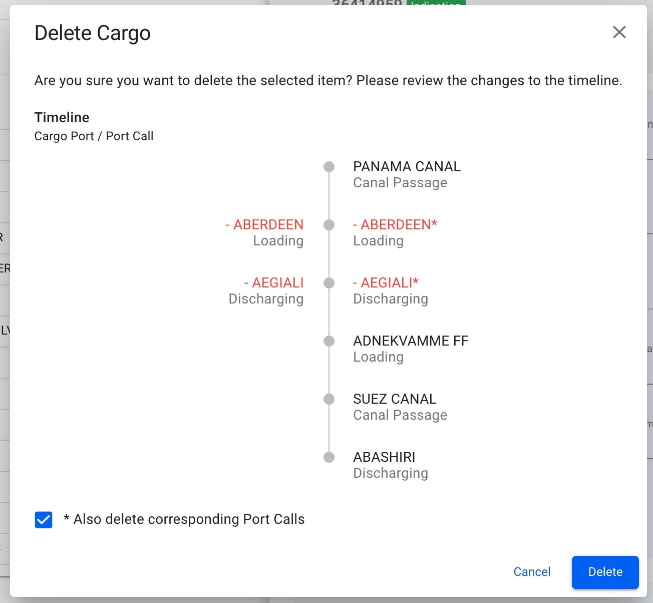 2️⃣ When deleting a cargo which has cargo ports linked to port calls which are not linked to any other cargoes cargo port you will get option to also delete the linked port calls. This makes it easier to keep your schedule clean and correct.