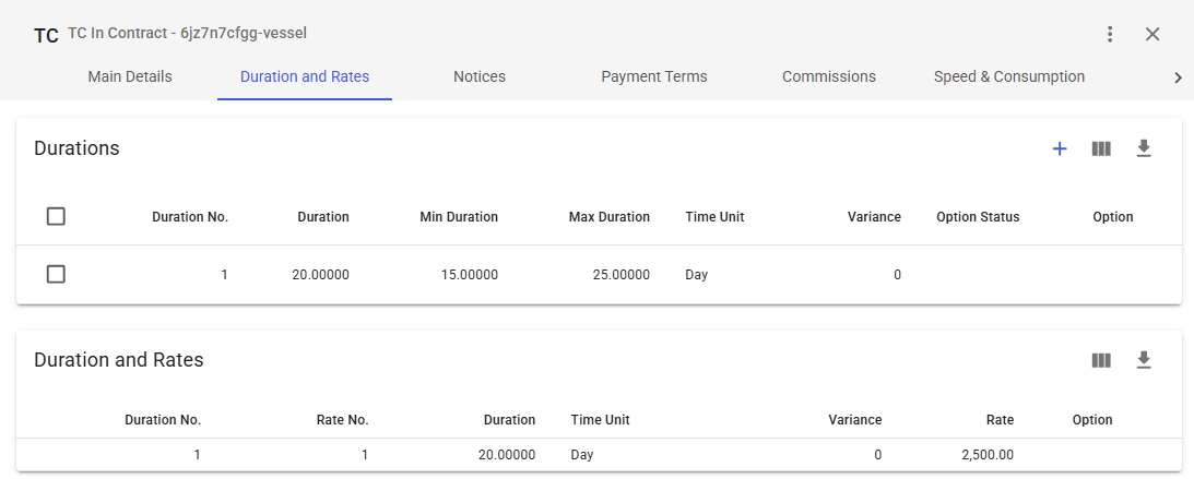 Duration and Rates, includes a list of the Rates along with the connected Duration on the Time Charter Contract.