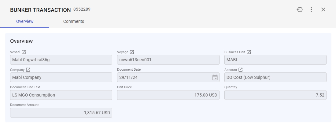 Selecting a 'Ready for Posting' or 'Posted' transaction from the list in the 'Posted' tab opens the bunker transactions drawer as shown in the picture below.