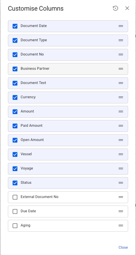 The search field makes it possible to query for specific invoices based on numerous options. The options include document number, document text, external document number, internal comment, invoice text, business partner name, vessel name, and voyage reference. All of the invoices where one or more of these options include the search string will be shown.