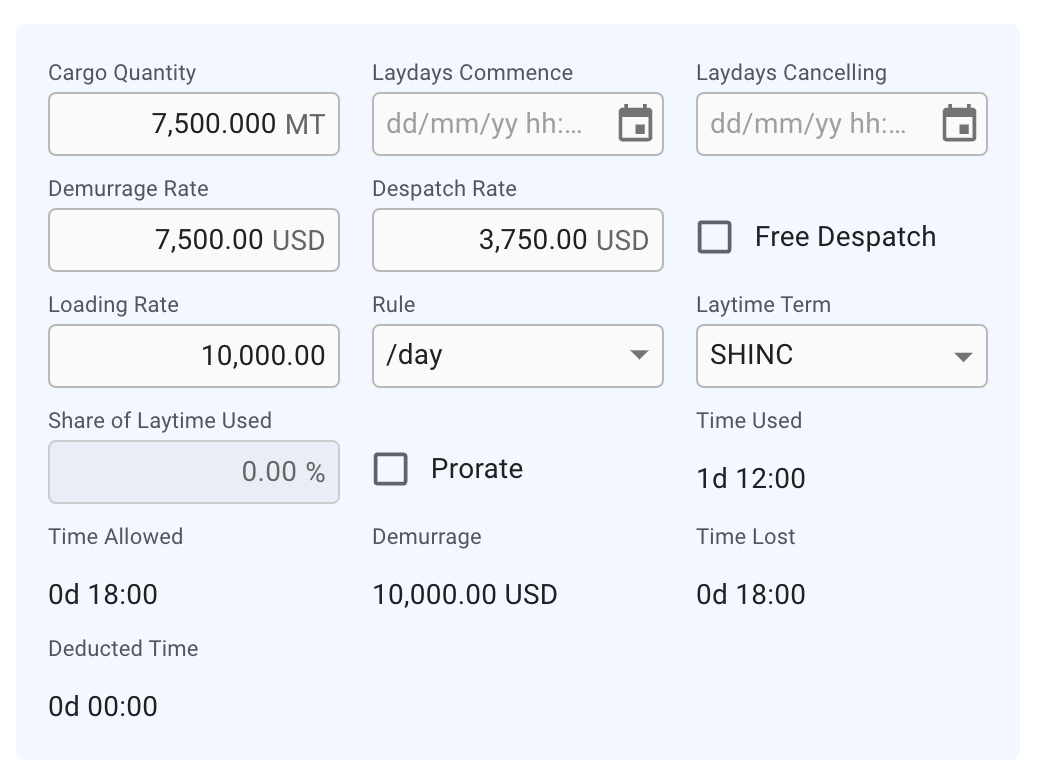 When expanding a cargo port panel, a section for displaying and editing certain fields of the cargo port can be found. The number of fields visible depends on the type of port call, aggregation and more.