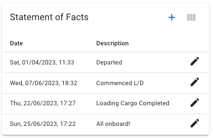 After confirming you will see the new event added to your Statement of Facts list for this port. Your selected new event should appear with the selected date and time: