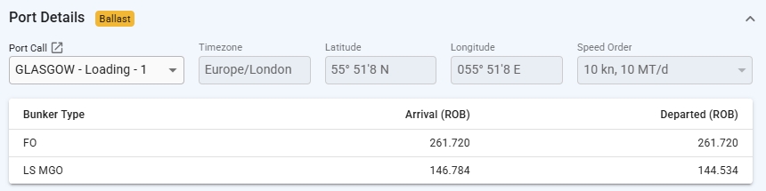 Non-deviation downtimes created by selecting a Port Call from the voyage schedule, will display some information about the port call, such as reason for call, speed order, and bunker ROBs in the Port Details section.