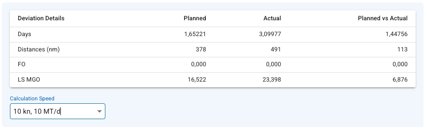Below these, a table for Deviation Details is displayed. This table shows you the difference between a direct route between the start and end port call, and the actual voyage schedule. You can also specify a specific speed for the vessel.