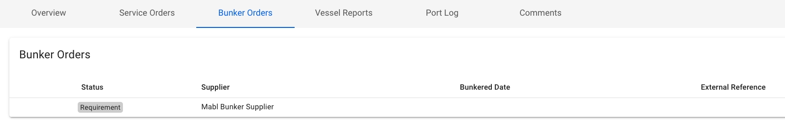 To view bunker orders on a Port Call, open the drawer for the given Port Call by clicking it in the list. When inside the drawer click the "Bunker Orders" tab, which will display registered bunker orders in a table.
