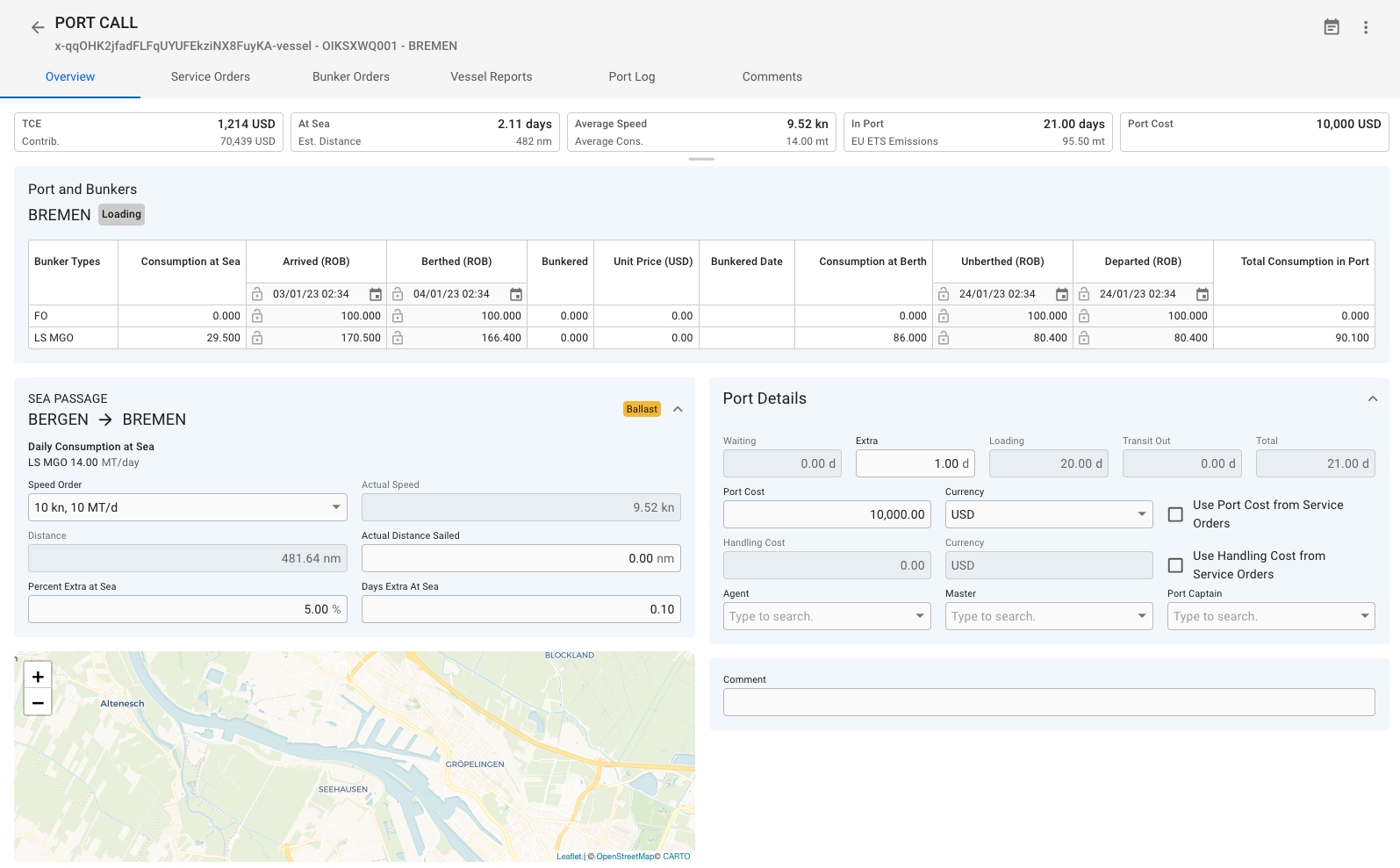 Bremen is the first port call on a voyage. The voyage has 100 MT of remaining onboard FO and 200 MT remaining onboard MGO fuel. The arrival event (ROB) contains a summary of remaining fuel, accounting for the consumption at sea (consumption between ballast/previous port call departure and current port call arrival): 100 MT of FO and 170.50 LS MGO. The same logic applies to future events (e.g., Departure ROB would correspond to Arrival ROB minus consumption in Port), further port calls, and even the next consecutive voyages.