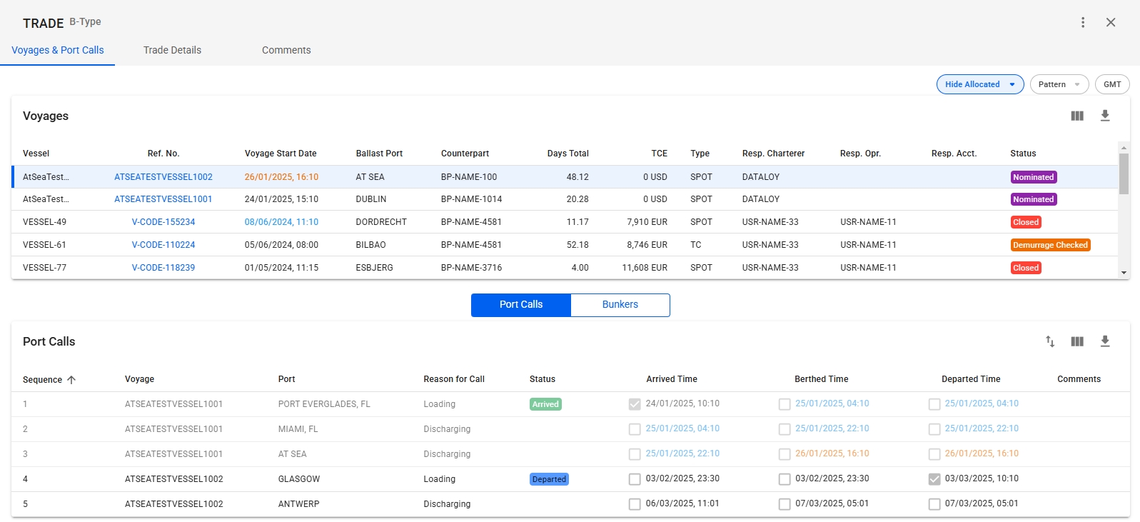 To maintain the trade click the trade in the list. The selected trade will be opened in a trade drawer where you can view all the voyages from a trade and the port calls and bunkers from these voyages, and edit the trade details.