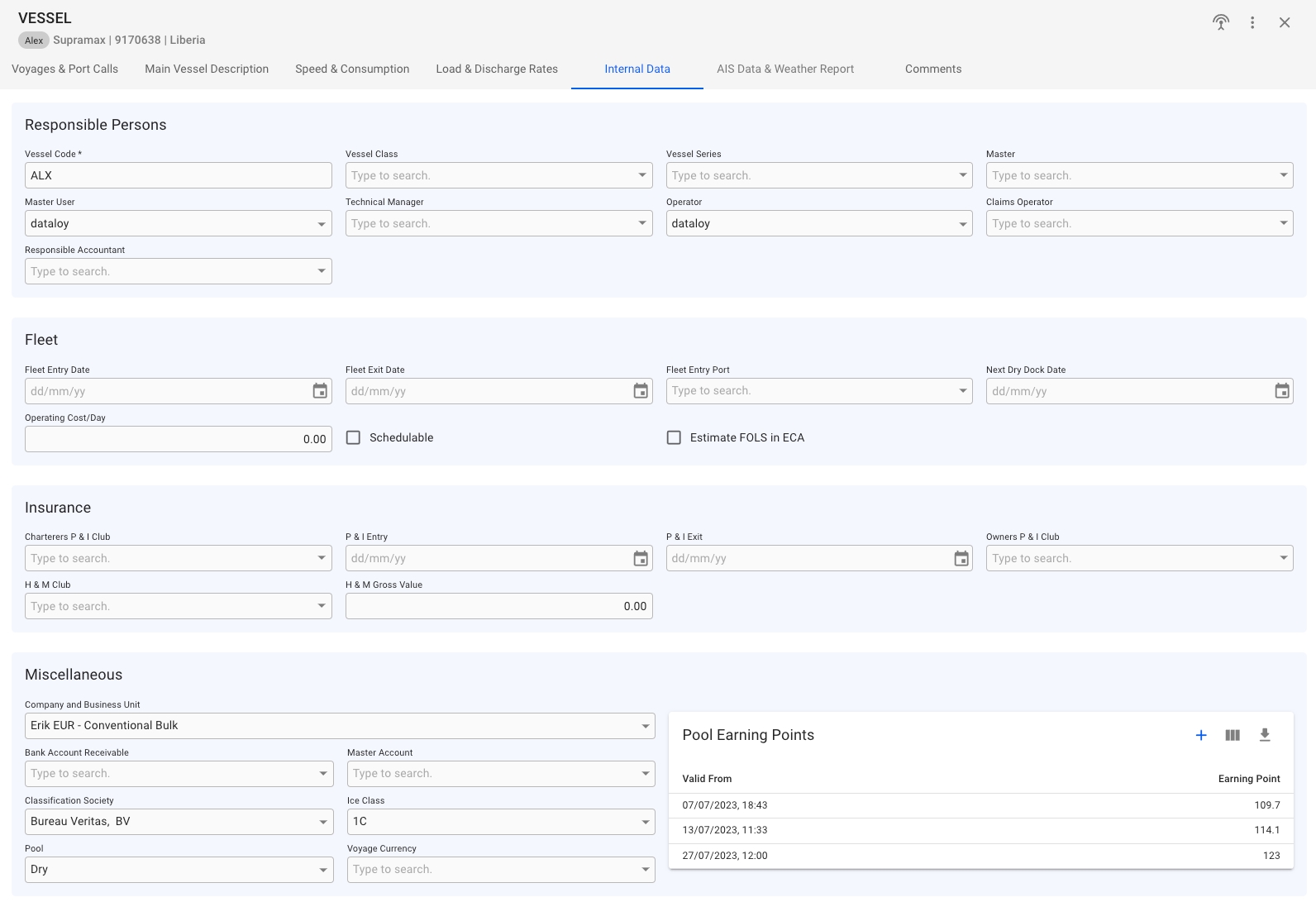 Here, you can set fields like Company and Business Unit, Bank Account Receivable, Master Account, Classification Society, specify the Ice Class (if classification society is selected), and Pool, as well as the Pool Earning Points. In this table, you can create, edit, and delete a Pool Earning Point: