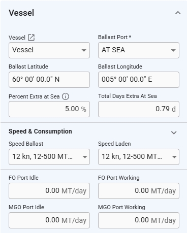After creating a voyage, the ballast latitude and longitude can be modified by opening the voyage drawer and navigating to the vessel section (see Figure 3). These fields will only be available when the ballast port is set to 'At Sea'.