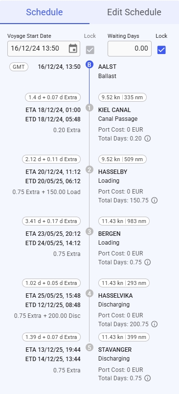 This is a timeline of port calls on a voyage, in which the left side displays the ETA and ETD time- and dates, as well as Days Extra and Waiting Days, with the last two also having a hover/tooltip. On the right side displays the port calls, their reason for calls, Port Costs and Total Days, with also a tooltip on the last two here.