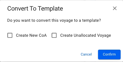 After selecting the action you will get a confirmation popup modal which allows you to select to 'Create New CoA' and 'Create Unallocated Voyage' when converting to template. When clicking the 'Confirm' button, you will be brought to the template voyage's drawer.