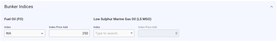 Bunker Indices: this section helps to have a better overview of bunker indices even when the fuel types FO and LS MGO are not consumed by a vessel. By default, the section is collapsed, providing information regarding the bunker indices. Once expanded, the indices can be altered. Refer to Figure 1 for example: