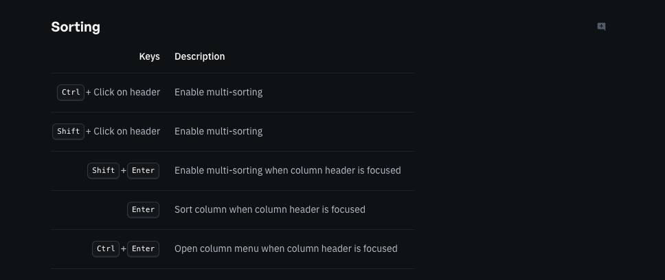 ENTER toggles column sorting and SHIFT + ENTER toggles multi column sorting