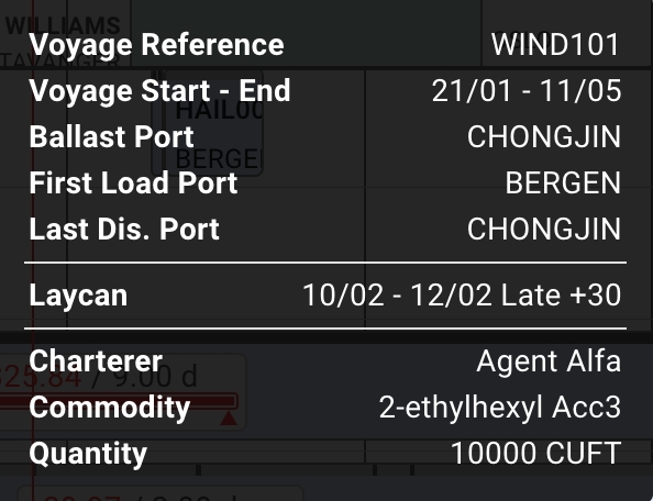 When hovering over a scheduler bar, a tooltip will pop up with additional information about the voyage: