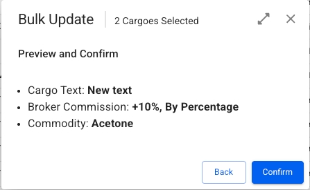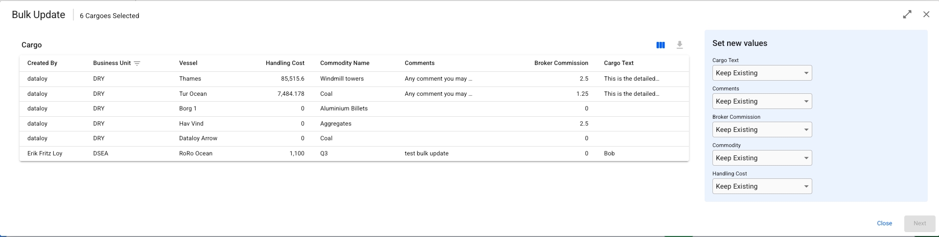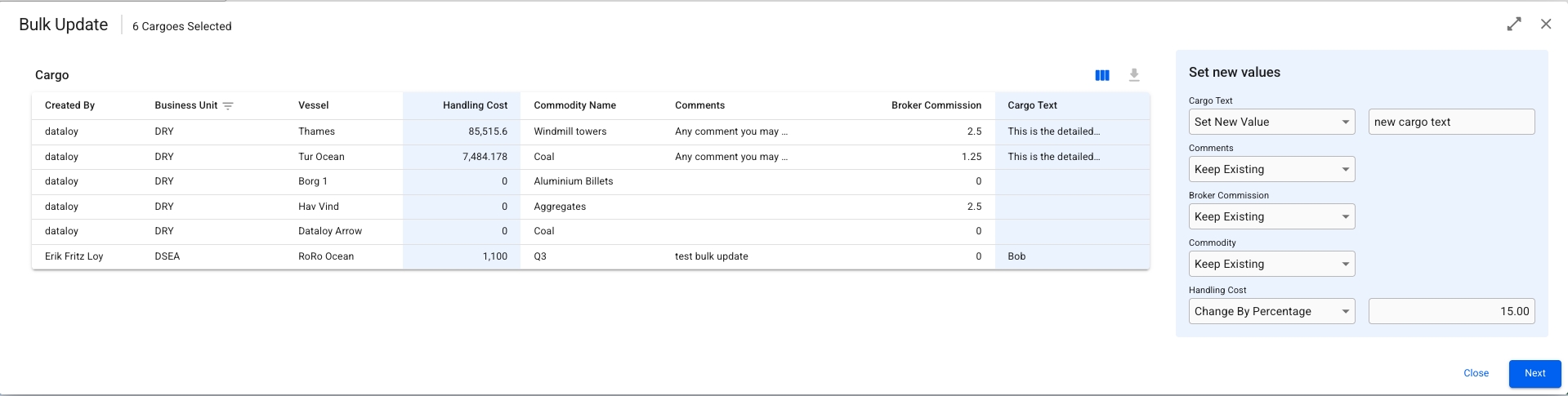 Bulk Update lets you modify specific fields across multiple rows (voyages, items, etc.) at once, saving time and reducing repetitive actions. Each list will show different fields for bulk updating. If no bulk-editable fields are configured for a particular list, an empty Bulk Update window will appear.
