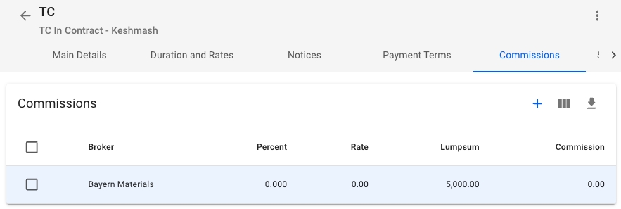 By clicking the -icon in the upper right corner of the Section you can create new Comissions. Clicking on a Commission in the list will allow you to edit or delete the commission.