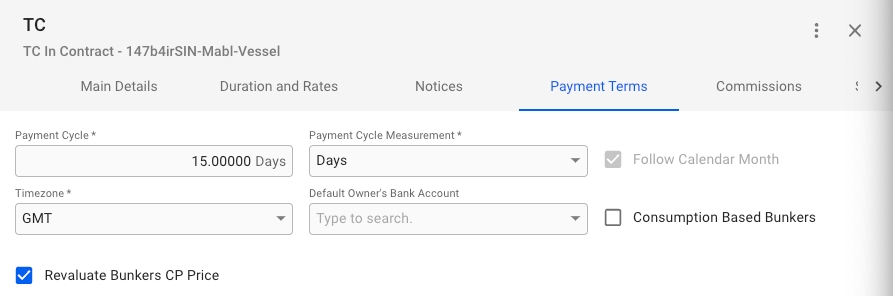 In the Payment Terms tab you edit and enter Payment information on the TC.