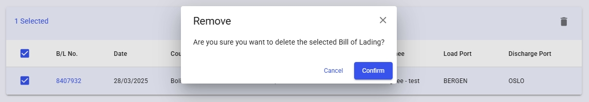 To remove a bill of lading, tick the checkboxes for the entries you want to remove, then click the remove icon in the top-right corner. A confirmation pop-up will appear, which you must confirm, as seen in the figure below.
