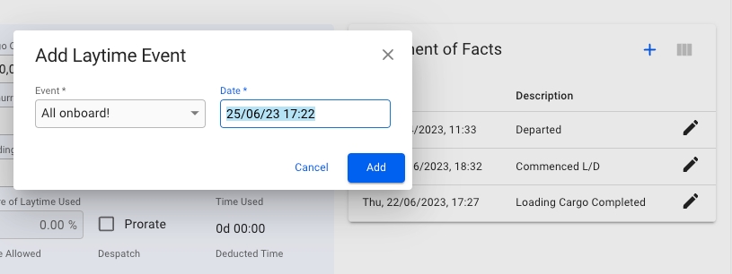 To edit or delete an event simply click on the the row that contains it, Here you can edit the date or select delete in the modal that appears and confirm - Note that this will delete it from the Statement of Facts list but NOT from the port log event list in the port call drawer while editing the date will effect both locations.