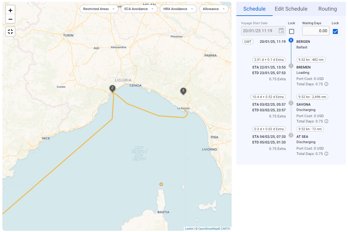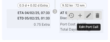 Furthermore, 'At Sea' port call coordinates can be updated in the 'Edit Port Call' modal, with all calculation automatically adjusted to reflect the new location.