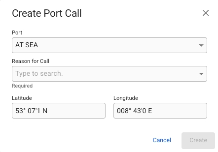 There is a placeholder port named "AT SEA," which can be added to the schedule. This port doesn't have an explicit location, and its coordinates should be defined by the user, allowing the freedom of having a port call anywhere. When selecting ‘AT SEA’ as the port name, the system automatically displays two additional fields—Latitude and Longitude—in the ‘Create Port Call’ and ‘Edit Port Call’ modals (see Figure 1).