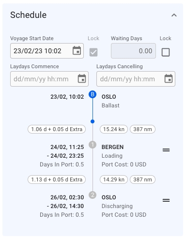 This section is highly customizable: e.g., you may change the voyage start date, lock it, edit the Voyage's speed, update the port call sequence, and much more!