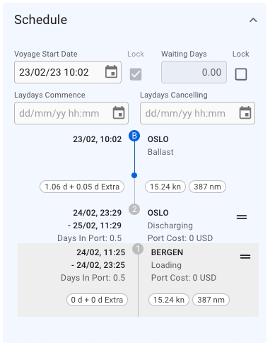The Schedule Timeline is a fully interactive module. Each port represents a draggable block - if you reorder the blocks, you will update the port call sequence on the opened voyage correspondingly: