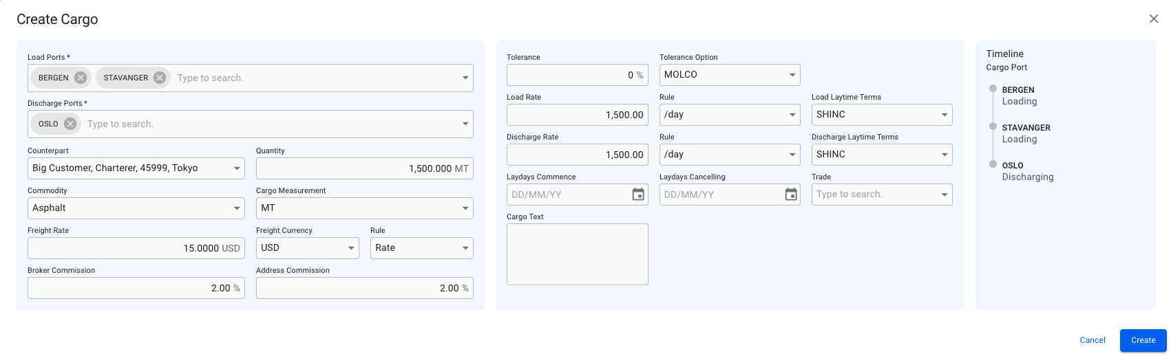 Create CargoCreate Cargo From CoA TemplateCreate Cargo on TC VoyagesCreate Cargo by Importing from ExcelCreate Cargo From Existing CargoSelect Create Time Charter Out.