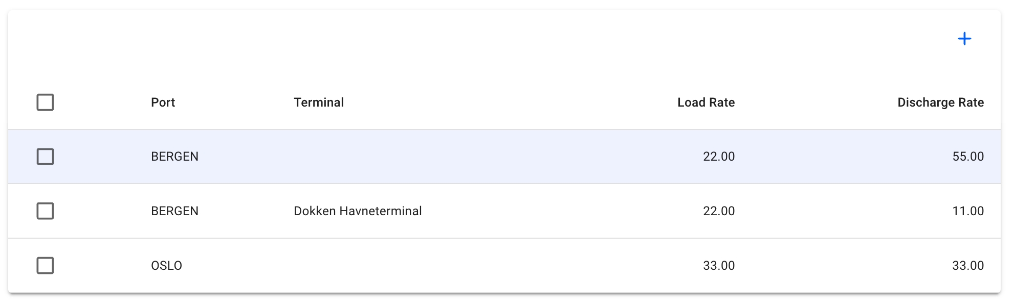 The Load and Discharge rates section is an an overview of the load and discharge rates applicable for ports and terminals. It must not be mixed with the vessels' max load and discharge rates.