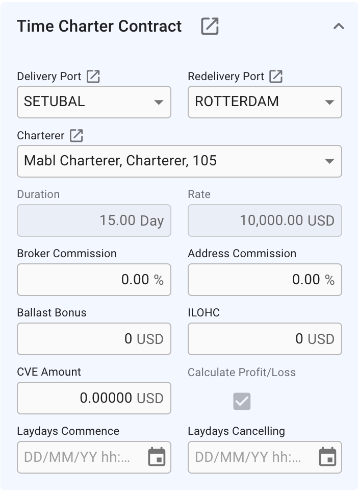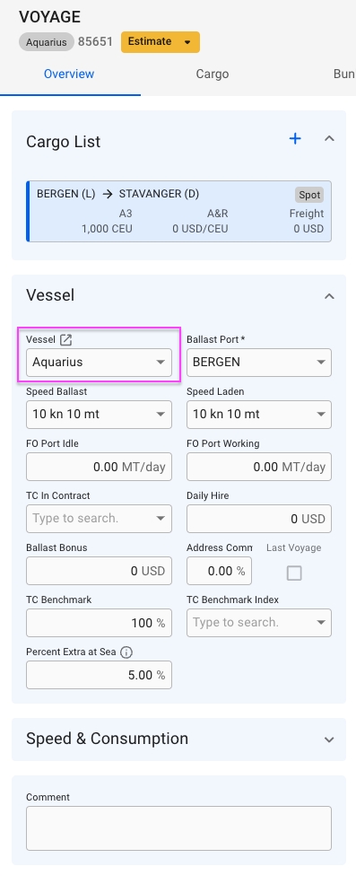 When choosing a Vessel, the Ballast Port, Owner and Currency fields will be automatically filled out with the vessels last port call, owner and default voyage currency.