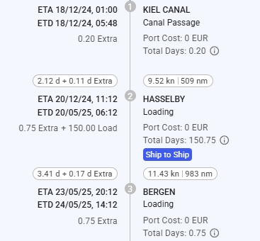 The "result" chart is a waterfall chart for costs and revenue on the voyage. Hover the mouse over the bars to see further details behind the calculation.
