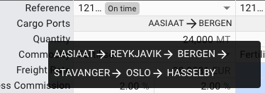 In the trade field a combination of Route, Trade and Pattern can be selected to ensure trade is set properly. When changing to a different option, the cargoes on the voyage will be updated with the same trade.