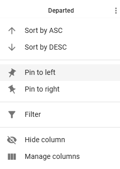 Expanding the menu displays a list of options for the column (see Figure 3), including sorting, pinning the column's position, and column management options. Basic sorting can also be performed by clicking the arrow that appears when hovering over a column or by clicking the column header itself (see Figure 2).