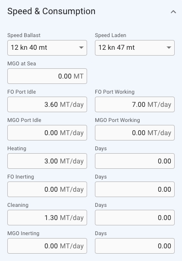 Access "Speed and Consumption" data in the top tab menu. This page provides tools for precise vessel consumption configuration: