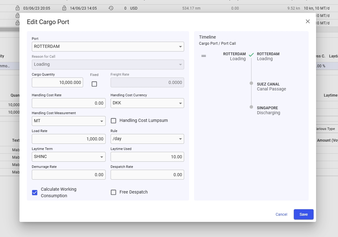 Like all grids, the Cargo Ports fields can be edited directly within the grid. Alternatively, you can click the Edit Cargo Port icon in the left-most column (see Figure 1) to open the "Edit Cargo Port" modal. The modal will appear on top of the voyage drawer as seen in the figure below.
