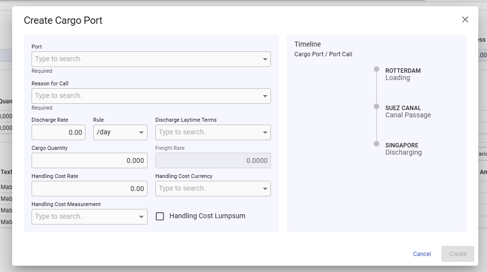 To add a new cargo port to the voyage, click the blue plus sign on the right-hand side of the grid header (see Figure 1). This will open a modal, as shown in Figure 2, where you can create the new cargo port.