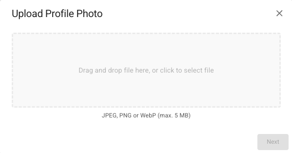 A modal will open where you can upload images of different types (JPEG, PNG, WebP). The file size limit is 5 MB. After uploading, you can drag and zoom the photo to capture the perfect avatar profile.