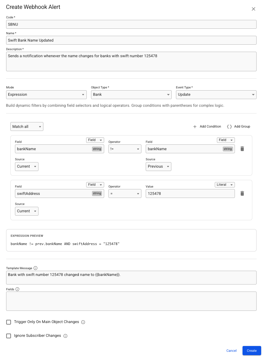 Below is an example of a Webhook Alert with an Expression requiring a change of the field bankName and the swift address to equal a number for a notification to be sent. The expression builder allows building complex conditions to limit the amount of notifications to be informative and wanted. \