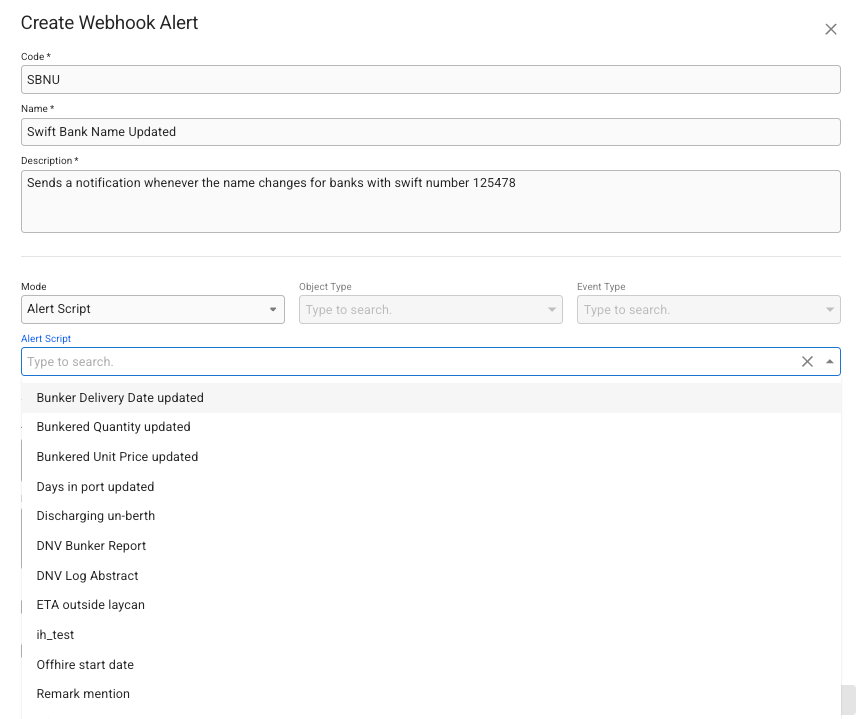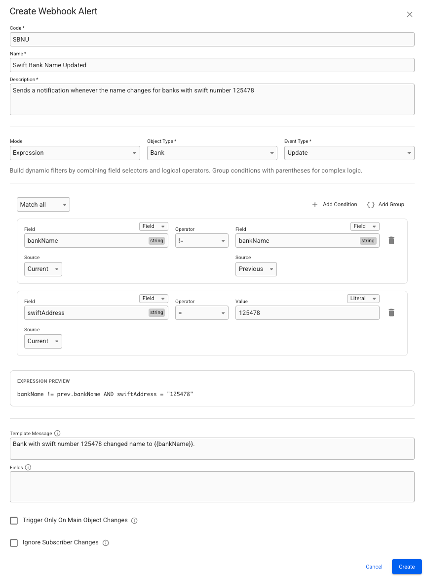 Below is an example of a Webhook Alert with an Expression requiring a change of the field bankName and the swift address to equal a number for a notification to be sent. The expression builder allows building complex conditions to limit the amount of notifications to be informative and wanted. Its also possible to create a Webhook Alert with an Alert Script as the trigger.