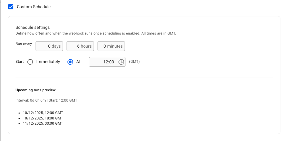 When using an Alert Script, you can configure a schedule for when it should run. The schedule lets you set the start time for the first execution and the interval between each run. The script will then execute automatically at those intervals, regardless of data changes. Scheduling is only available for templates using Alert Script.