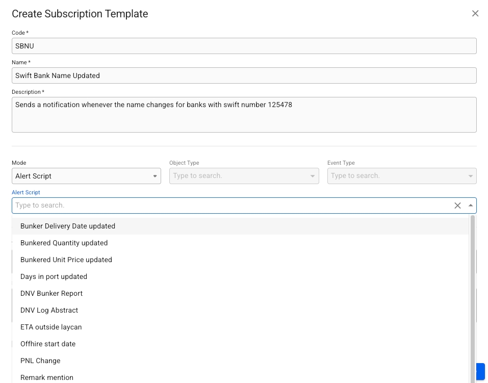 Below is an example of a Subscription Template with an Expression requiring a change of the field bankName and the swift address to equal a number for a notification to be sent. The expression builder allows building complex conditions to limit the amount of notifications to be informative and wanted. Its also possible to create a Subscription Template with an Alert Script as the trigger.
