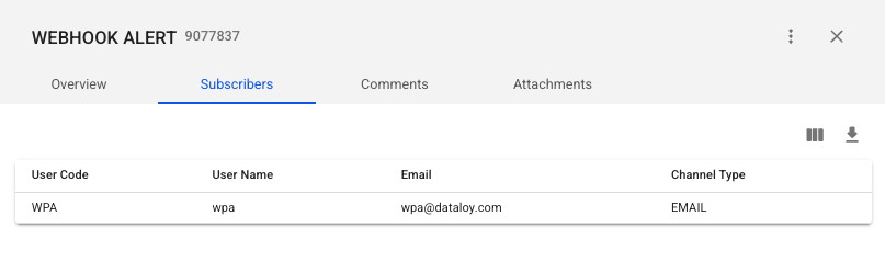 In the Subscribers tab you can view a list of all users currently subscribed to the opened Webhook Alert. Including information about the Channel Type of the subscription (send email or push notifications).