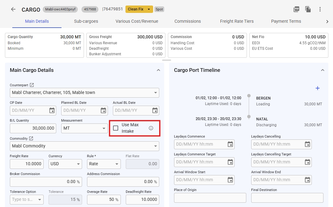 The booked quantity has to be set before the feature is enabled, as changing the cargo quantity manually is not allowed when max intake is automatically applied