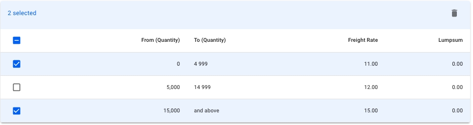 Volume: Here too, the freight rate is quantity-based. However, the per-unit freight rate is dependent on the range within which the total quantity falls. So, under this model, you would define the quantity ranges and the per-unit freight rate for each. Example: In the below example, a cargo of 8000MT would have a freight rate of 12 USD for the entire quantity.